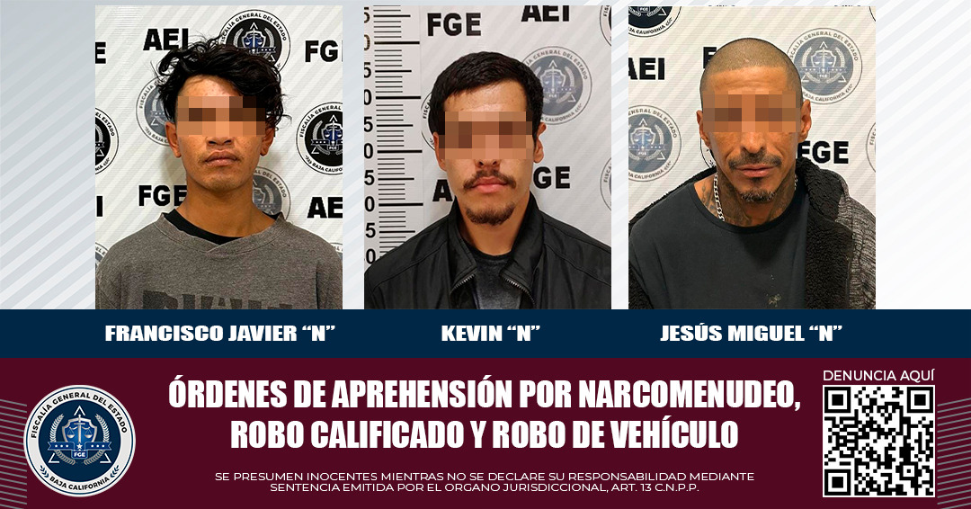 TIJUANA, B.C. La Fiscalía General del Estado cumplimentó, a través de la Unidad de Aprehensiones de la Agencia Estatal de Investigación, tres mandatos judiciales, por los delitos de narcomenudeo, robo calificado con violencia y robo equiparado de vehículo de motor en la modalidad de sustracción de partes.
