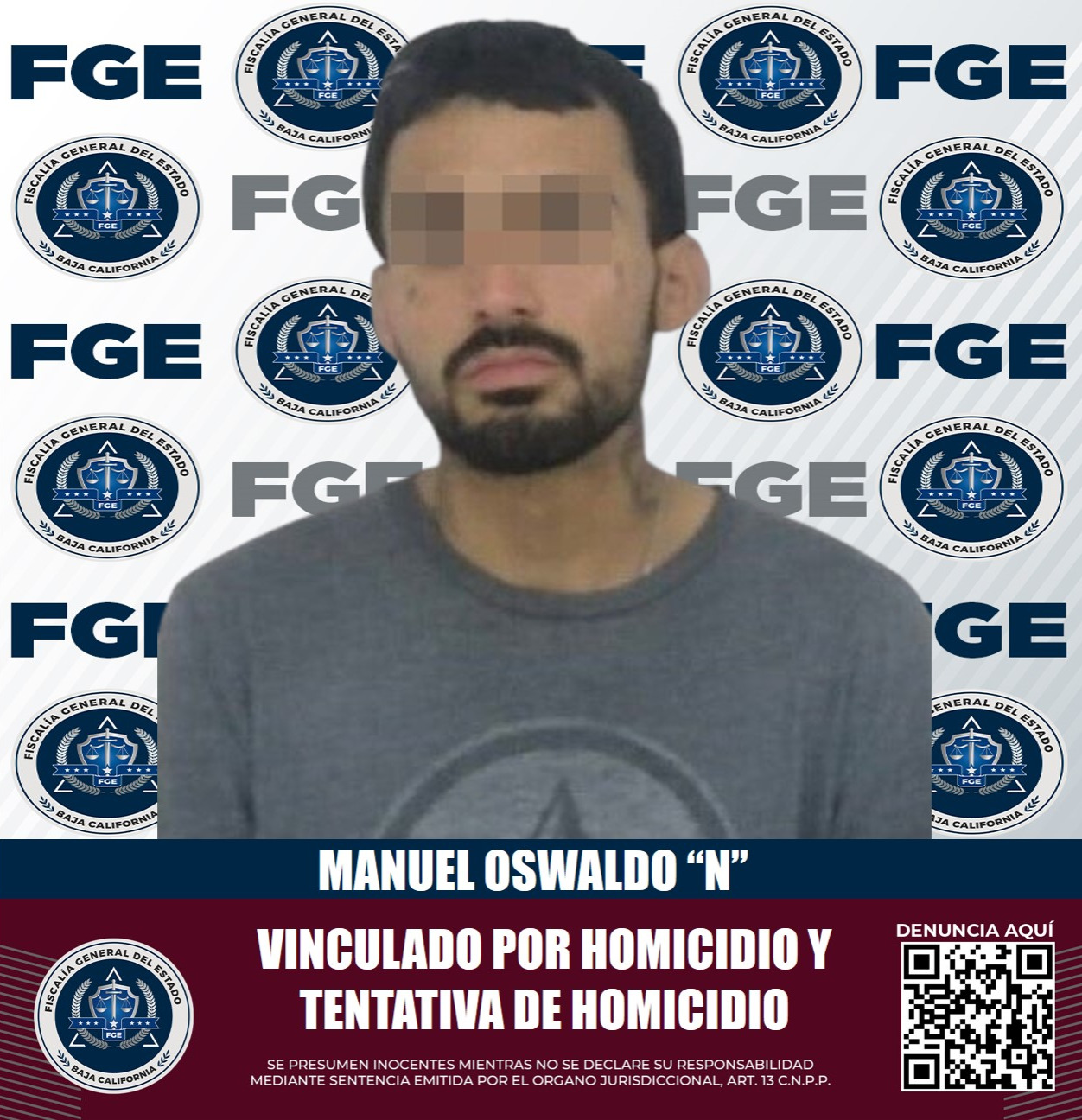 TECATE, B.C. La Fiscalía General del Estado, a través del agente del Ministerio Público de la Fiscalía Especializada en Delitos Contra la Vida, presentó ante un juez los elementos de prueba que involucran a Manuel Oswaldo “N” en los delitos de homicidio calificado y homicidio calificado en grado de tentativa, ambos contra miembros de instituciones policiales del estado en ejercicio de sus funciones.