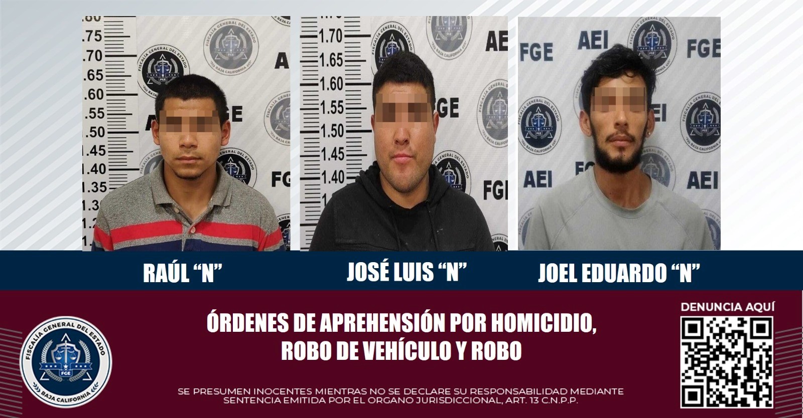 TIJUANA, B.C. Tres sujetos que contaban con orden de aprehensión activa fueron ubicados y puestos a disposición de un Juez de Control, tras labor de gabinete y campo desarrollada por elementos adscritos a la Agencia Estatal de Investigación de la Fiscalía General del Estado.