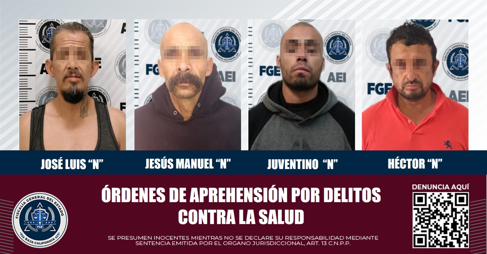 TIJUANA, B.C. Tras diversas acciones judiciales efectuadas por elementos de la Agencia Estatal de Investigación (AEI), se logró la captura de cuatro personas que eran buscadas mediante órdenes de aprehensión vigentes por delitos contra la salud. Quedaron a disposición de la autoridad competente para responder por el ilícito que se les imputa.
