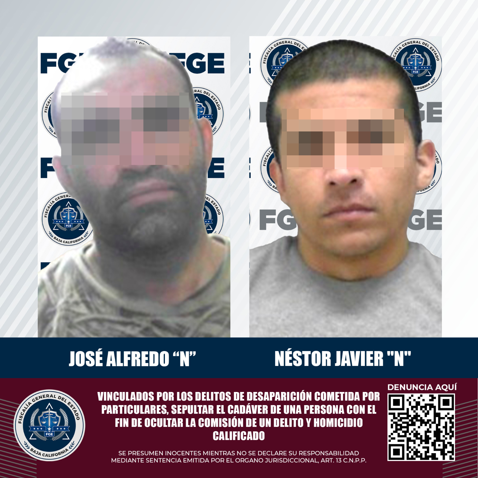 MEXICALI, B.C. Derivado del fortalecimiento de las investigaciones sobre la desaparición de personas, considerados como casos prioritarios para la Fiscalía General del Estado y como parte de los compromisos emanados de las reuniones realizadas por la Fiscal General, Ma. Elena Andrade Ramírez con los Colectivos de Búsqueda, dos hombres relacionados en estos hechos quedaron bajo proceso penal.