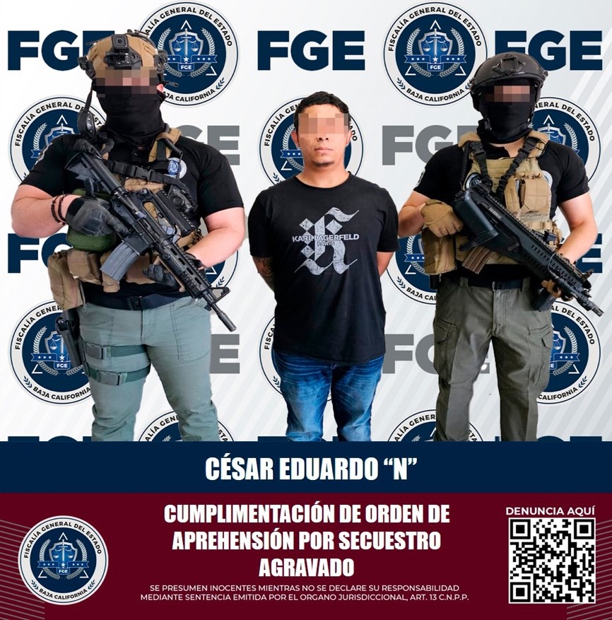 MEXICALI, B.C. La Fiscalía General del Estado de Baja California, a través de la Unidad de Investigación Especializada en Combate al Secuestro, cumplimentó orden de aprehensión a César Eduardo “N”, por su presunta comisión en el delito de secuestro agravado, por hechos ocurridos en 2020.