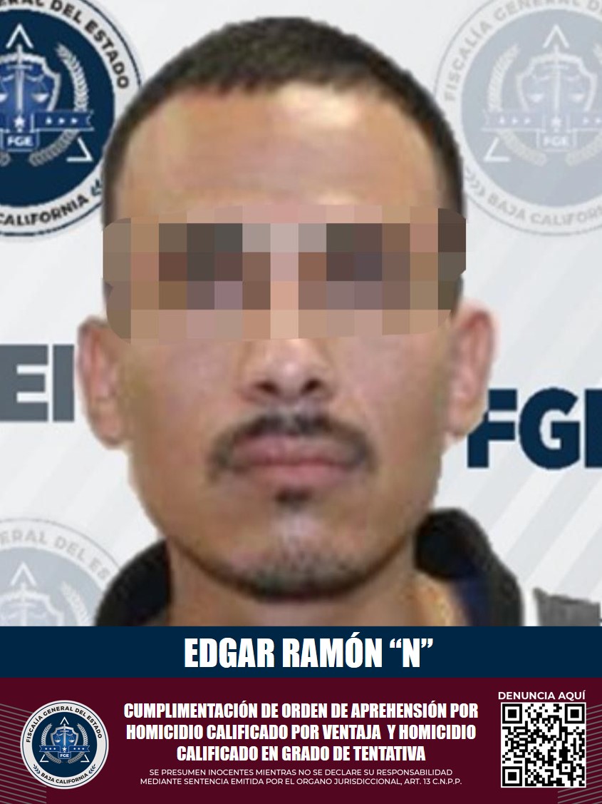 MEXICALI, B.C. La Fiscalía General del Estado, a través de elementos de la Agencia Estatal de Investigación, el pasado 22 de septiembre, cumplimentó una orden de aprehensión en contra de Edgar Ramón “N” por la probable comisión del delito de homicidio calificado por ventaja y homicidio calificado por ventaja en grado de tentativa.
