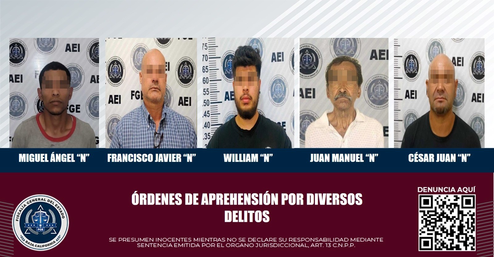 TIJUANA, B.C. En continuidad con las acciones de investigación en la persecución de los delitos, la Fiscalía General del Estado mediante labor de la Agencia Estatal de Investigación (AEI), cumplimentó cinco órdenes de aprehensión por diversos ilícitos; en uno de los casos, se detuvo a una persona con un mandamiento judicial activo en el estado de Sonora.