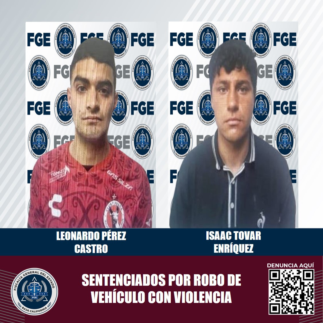 PLAYAS DE ROSARITO, B.C. Tras la aportación de pruebas fehacientes, la Fiscalía Regional de Playas de Rosarito logró acreditar la culpabilidad de Leonardo Pérez Castro e Isaac Tovar Enríquez en el delito de robo de vehículo de motor ejecutado con violencia física y moral. Ambos individuos fueron sentenciados a 5 años 4 meses de prisión.