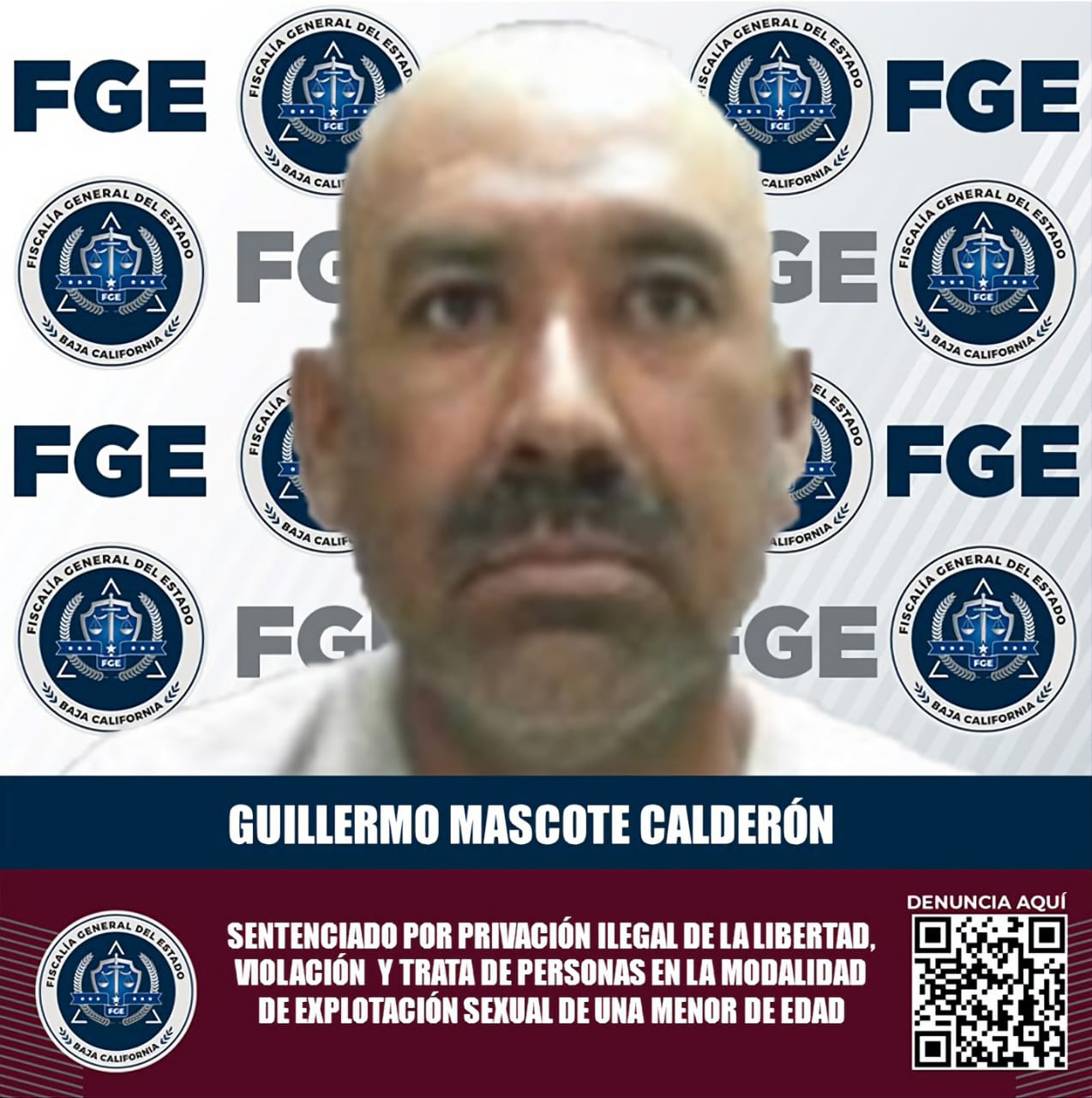 ENSENADA, B.C. Una efectiva investigación realizada por la Fiscalía General de Baja California demostró la plena responsabilidad de Guillermo Mascote Calderón, en los delitos de privación ilegal de la libertad agravada, violación equiparada agravada y trata de personas en la vertiente de explotación sexual de una menor de 18 años de edad, hecho por el cual fue condenado a 25 años en prisión.