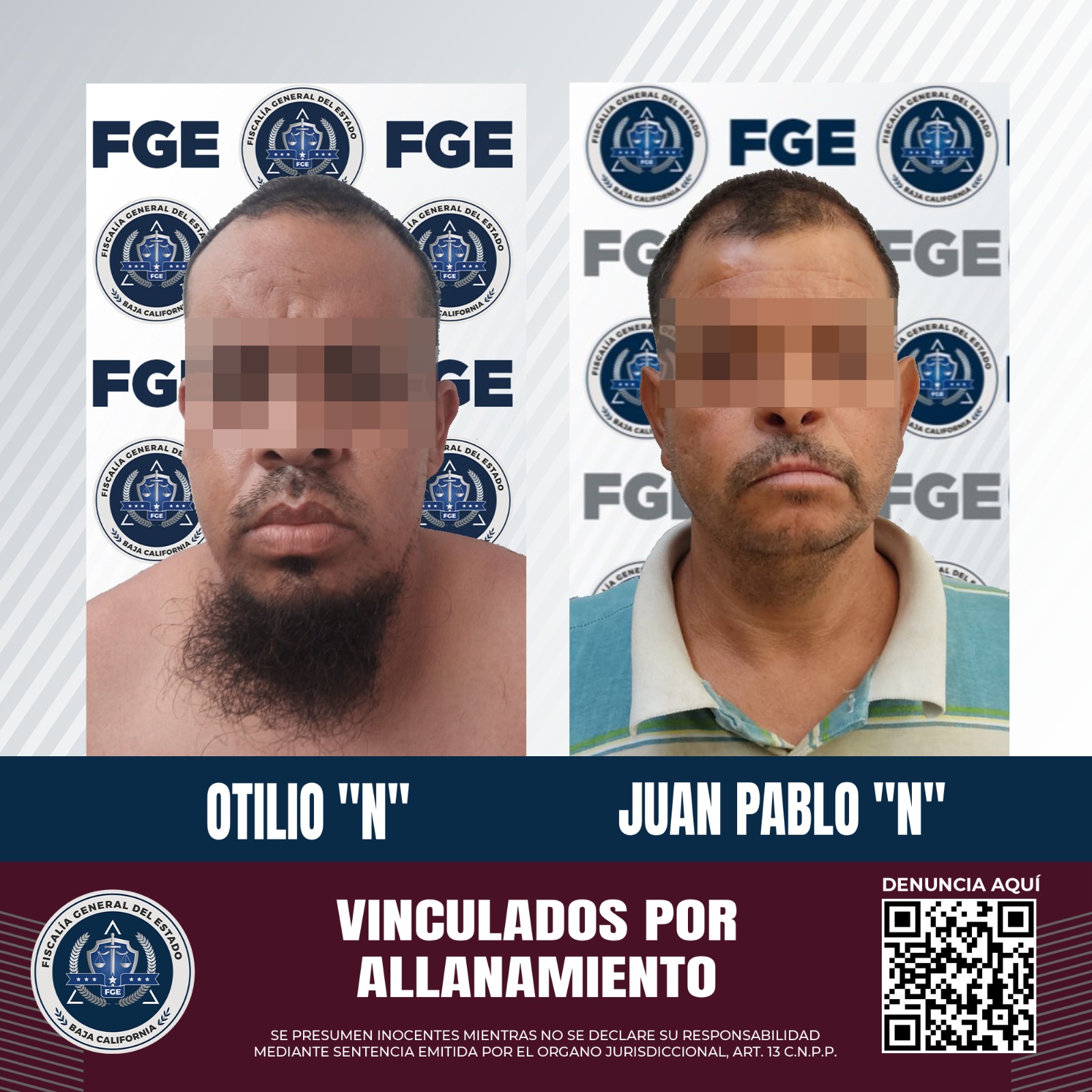 MEXICALI, B.C. La Fiscalía Regional de Mexicali, a través de la Unidad de Investigación con Detenidos Poniente, logró con base a los elementos probatorios, la vinculación de dos hombres relacionados en el delito de allanamiento.