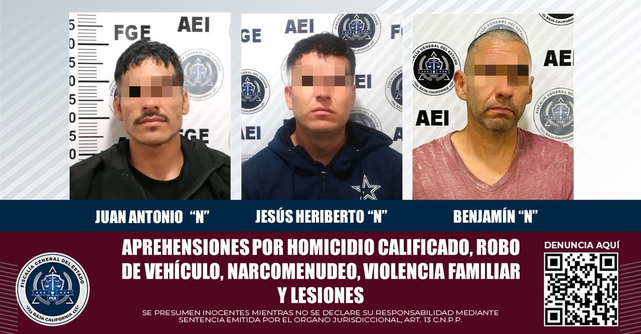 TIJUANA, B.C. La Fiscalía General del Estado de Baja California, a través de sus elementos adscritos a la Unidad de Aprehensiones de la Agencia Estatal de Investigación (AEI), ha logrado la captura de tres individuos que se encontraban prófugos de la justicia.