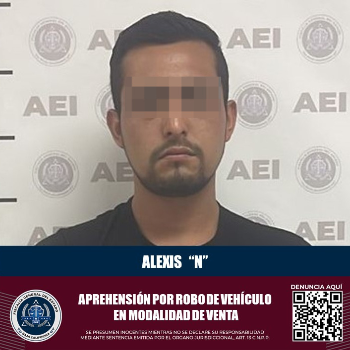 SAN QUINTÍN, B.C. Elementos de la Agencia Estatal de Investigación, de la Fiscalía General del Estado (FGE), capturaron a Alexis “N”, de 24 años de edad, quien contaba con orden de aprehensión vigente por el delito de robo de vehículo en modalidad de venta.