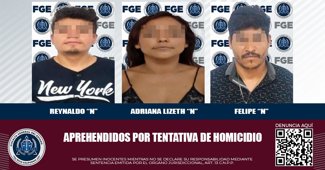 TECATE, B.C. La Fiscalía General del Estado, a través de agentes estatales de investigación, cumplimentó orden de aprehensión contra dos hombres y una mujer involucrados en el delito de homicidio calificado en grado de tentativa.