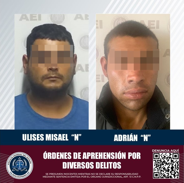 ENSENADA, B.C. La Fiscalía General del Estado puso a disposición de jueces de control, a dos hombres que contaban con orden de aprehensión por robo con violencia y robo equiparado de vehículo.