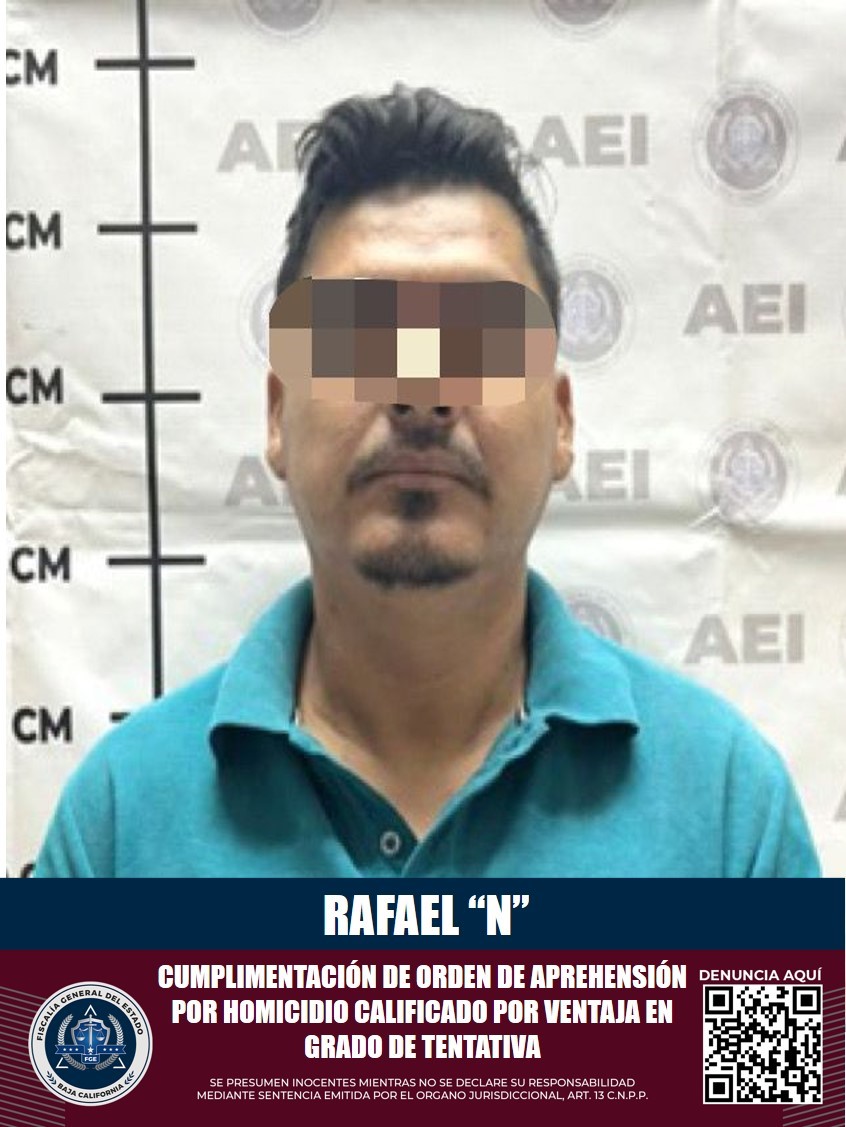 MEXICALI, B.C. Agentes adscritos a la Fiscalía Especializada en Delitos Contra la Vida, de la Fiscalía General del Estado, lograron la captura de Rafael “N” por el delito de homicidio calificado en grado de tentativa.