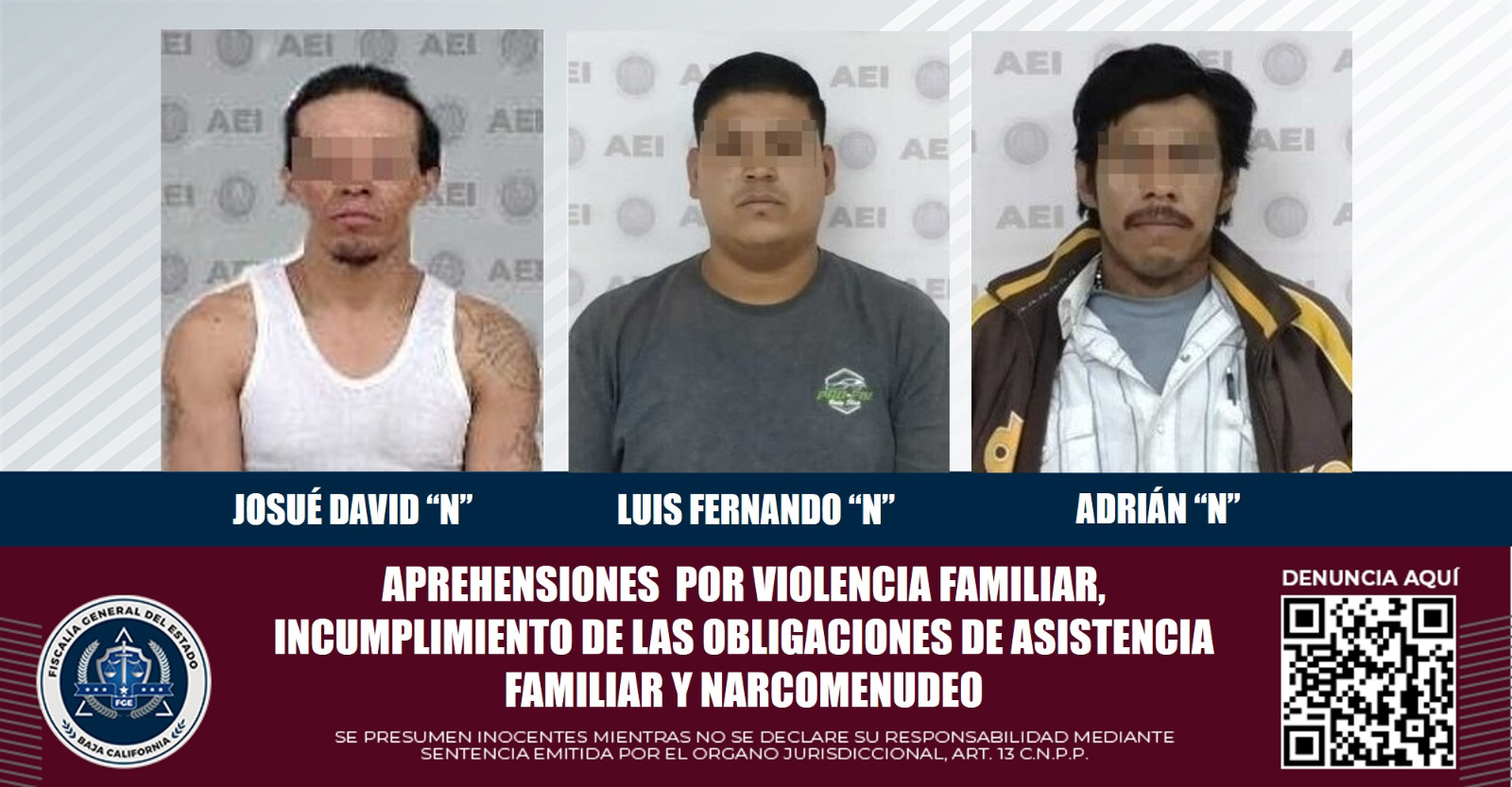 El primer individuo, identificado como Josué David "N", alias "El Guanatos", fue localizado en la calle Río San Ángel, en la colonia Praderas del Sol, en el municipio de Mexicali. Este sujeto tenía una orden de aprehensión activa por el delito de violencia familiar cometido en Tecate.