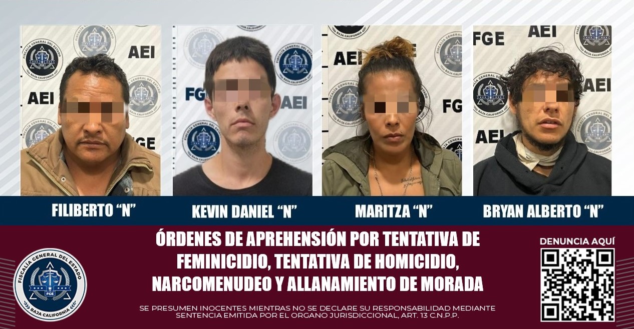 TIJUANA, B.C. Agentes estatales de investigación de la Fiscalía General de Baja California, cumplimentaron cuatro órdenes de aprehensión en contra de tres hombres y una mujer, quienes eran requeridos por jueces penales de la ciudad.