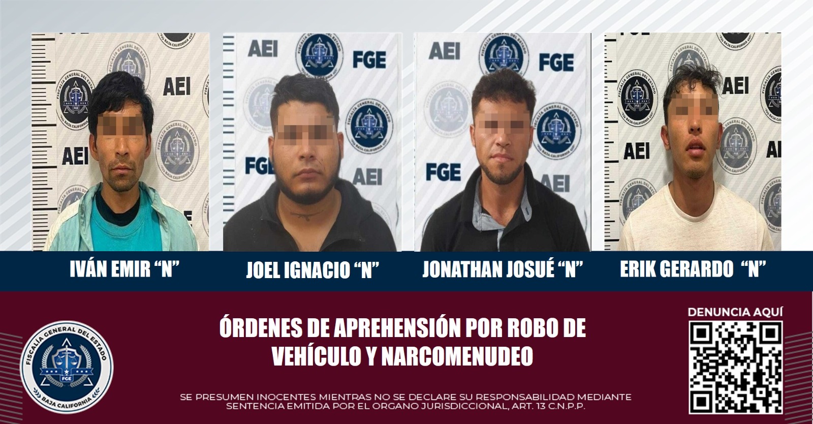 TIJUANA, B.C. Cuatro hombres, señalados de robo de vehículo y delitos contra la salud, según constan expedientes penales por separado, fueron aprehendidos tras diligencias desarrolladas por agentes estatales de investigación de la Fiscalía General del Estado.