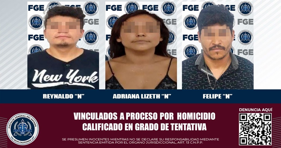 TECATE, B.C. Los imputados Reynaldo “N”, Felipe “N” y Adriana Lizeth “N" han sido vinculados a proceso y se encuentran en prisión preventiva. Esto ocurrió después de que fueron detenidos en cumplimiento de órdenes de aprehensión emitidas en su contra por el crimen cometido el 10 de septiembre de 2023 en un bar de esta ciudad, donde hirieron a un guardia de seguridad.