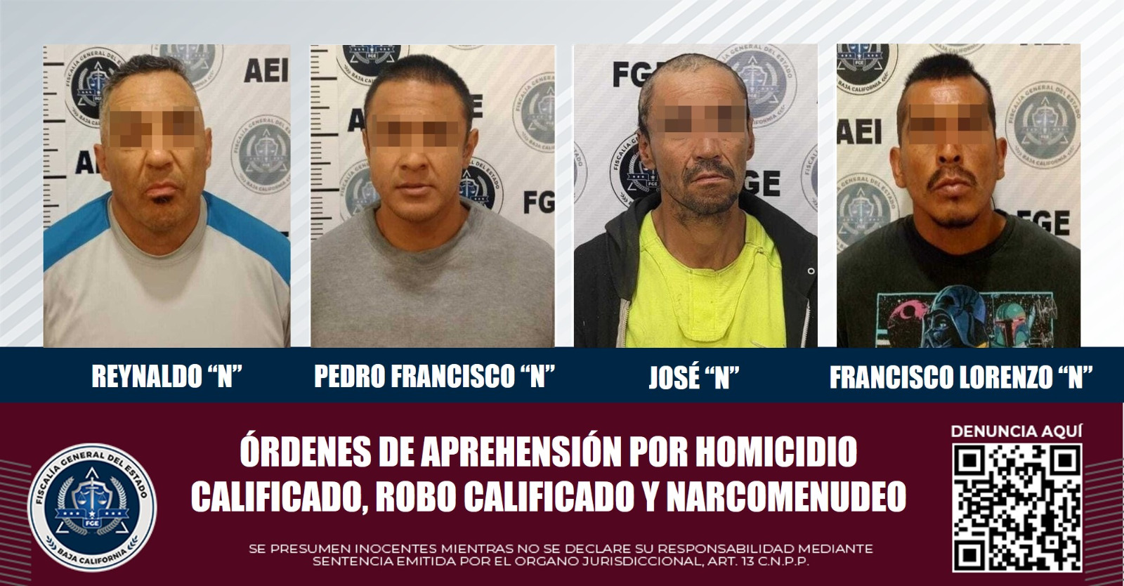 TIJUANA, B.C. Agentes estatales de investigación de la Fiscalía General del Estado (FGE) dieron cumplimiento a cuatro órdenes de aprehensión contra el mismo número de personas, las cuales eran requeridas por jueces de control por diversos delitos.