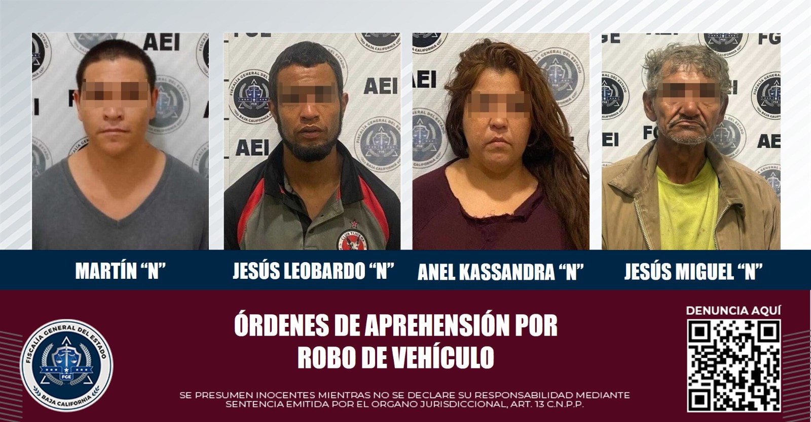 TIJUANA, B.C. Por tener cuentas pendientes ante la justicia, elementos de la Agencia Estatal de Investigación de la Fiscalía General del Estado, cumplimentaron, en acciones distintas, cuatro órdenes de aprehensión por el delito de robo de vehículo.