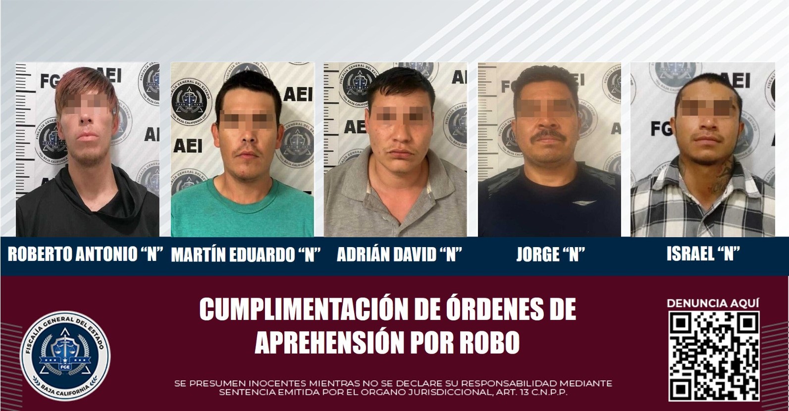 TIJUANA, B.C. Como resultado de información recabada en gabinete y campo, a cinco hombres se les cumplimentó orden de aprehensión en Tijuana por el delito de robo. Elementos de la Fiscalía General del Estado los pusieron a disposición de un juez para que respondan por el ilícito que se les imputa.