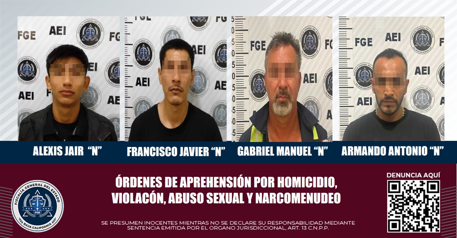 TIJUANA, B.C. Acciones de investigación permitieron la captura de cuatro sujetos, a quienes la Fiscalía General del Estado, a través de la Agencia Estatal de Investigación les cumplimentó una orden de aprehensión; dos de ellos están presuntamente implicados en un mismo caso penal por homicidio.