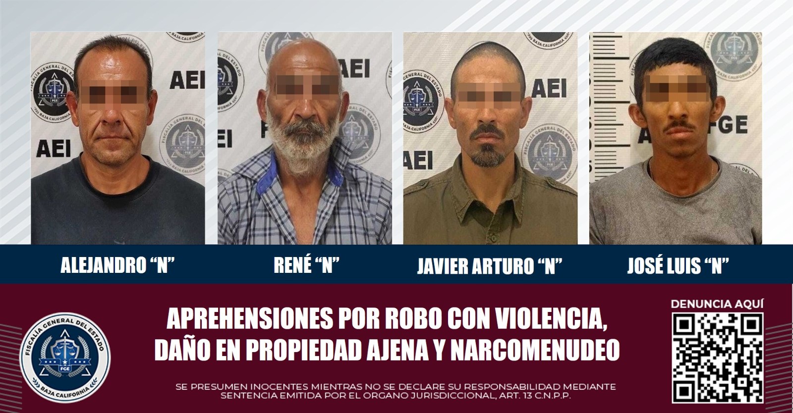 TIJUANA, B.C. Labor de investigación de la Fiscalía General del Estado deriva en la cumplimentación de cuatro órdenes de aprehensión por los ilícitos de daño en propiedad ajena, robo con violencia y narcomenudeo.