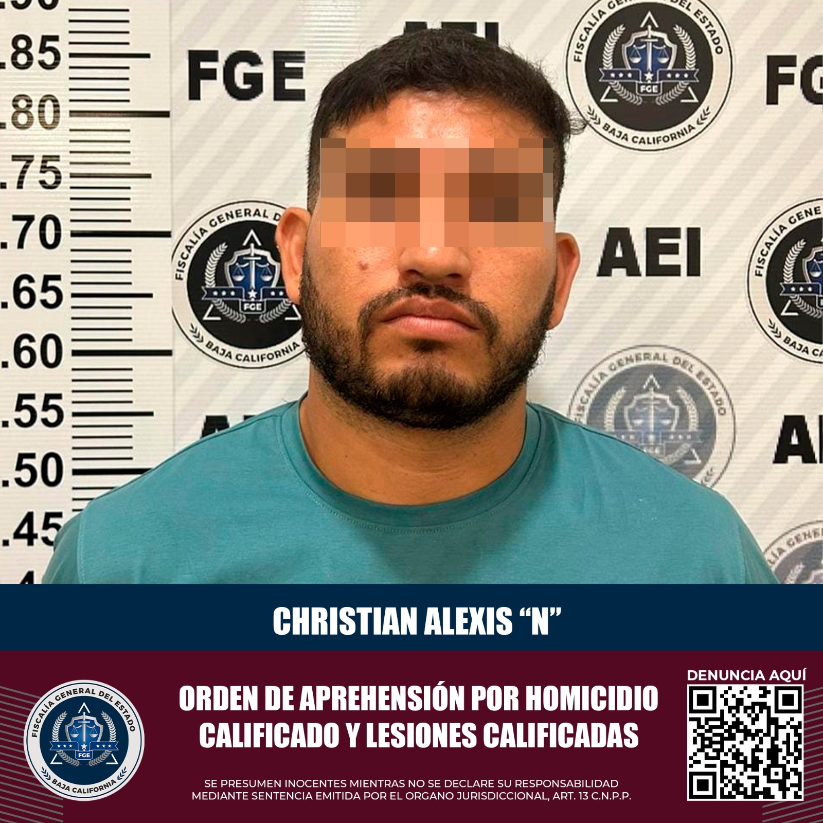 TIJUANA, B.C. Por su presunta responsabilidad en los delitos de homicidio calificado y lesiones calificadas, la Fiscalía General del Estado (FGE), a través de elementos adscritos a la Agencia Estatal de Investigación (AEI), logró cumplimentar orden de aprehensión en contra de Christian Alexis “N”, presunto integrante de un grupo criminal.