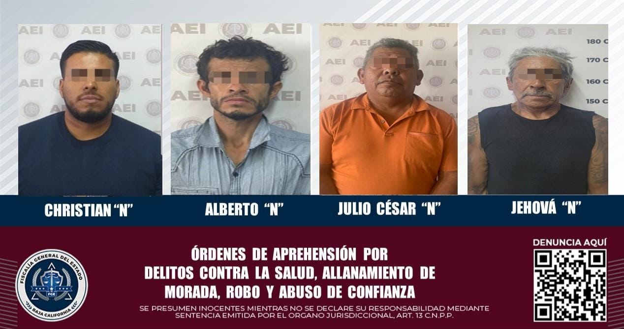 ENSENADA, B.C. Agentes de la Fiscalía General del Estado, en distintas diligencias, cumplimentaron órdenes de aprehensión giradas en contra de cuatro sujetos involucrados en los distintos delitos cometidos en actos por separado.