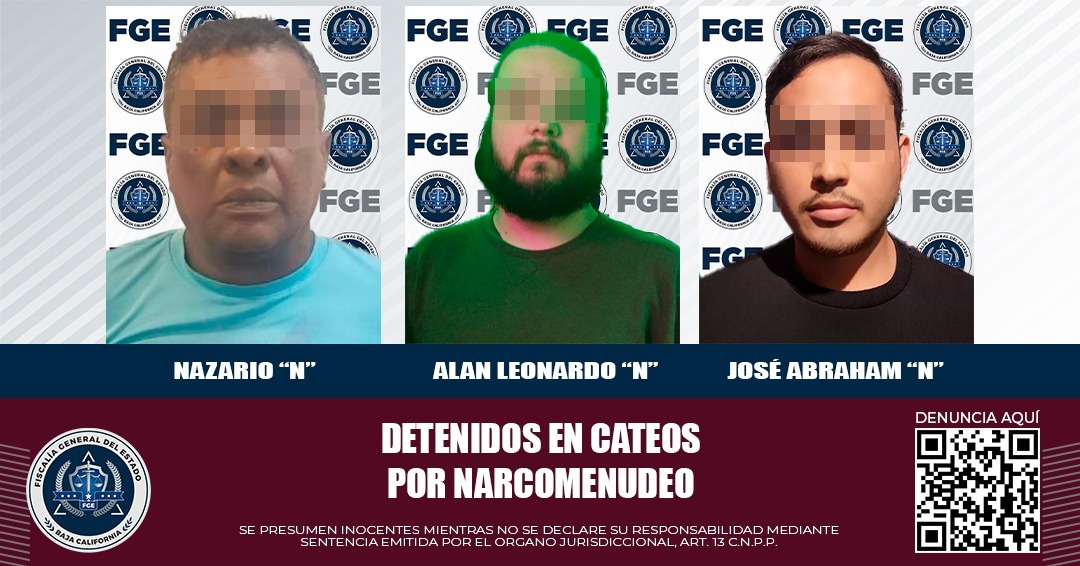 De esta forma se logró la detención de tres personas y se decomisaron diversas cantidades de cristal y marihuana, durante la ejecución de cuatro mandamientos judiciales en las colonias El Prado, Villa del Real, Camino Verde y Playas de Tijuana.