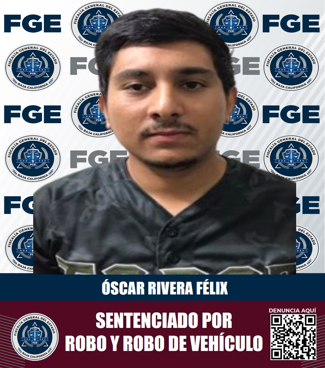 TIJUANA, B.C. La Fiscalía Regional de Tijuana, a través de las pruebas presentadas por el agente del Ministerio Público, logró, mediante un procedimiento abreviado, una sentencia de 6 años y 4 meses de prisión en contra de Óscar Rivera Félix, quien fue declarado penalmente responsable de los delitos de robo y robo de vehículo con violencia.