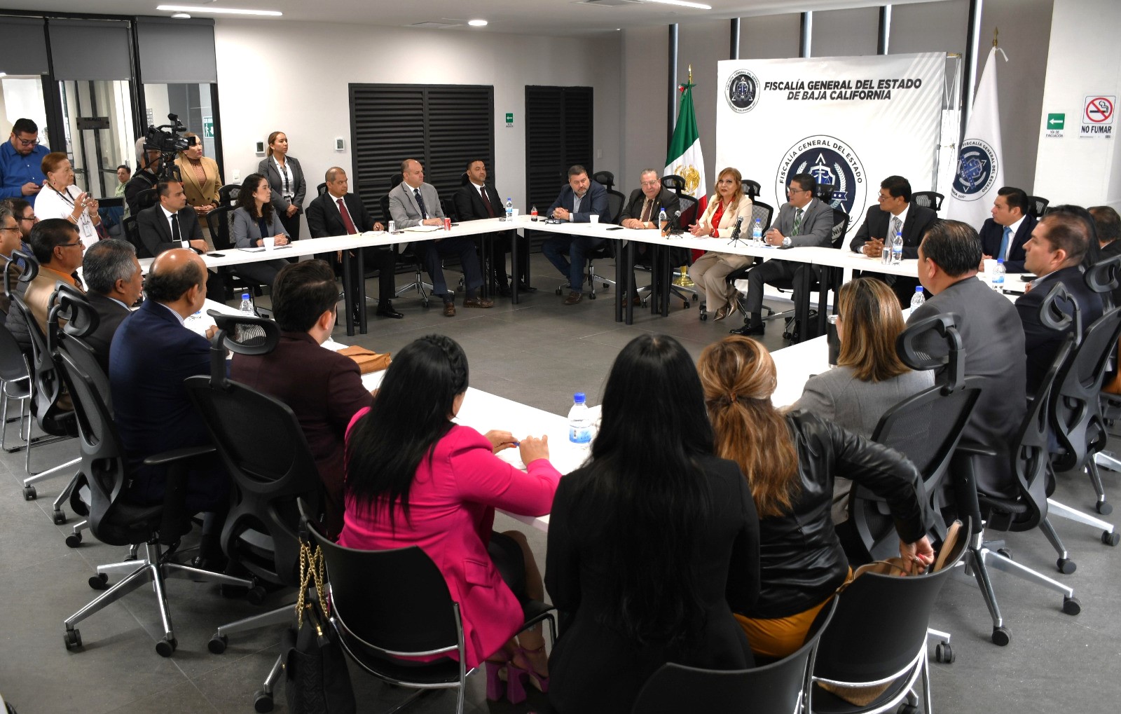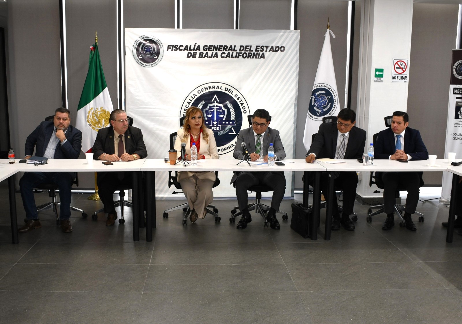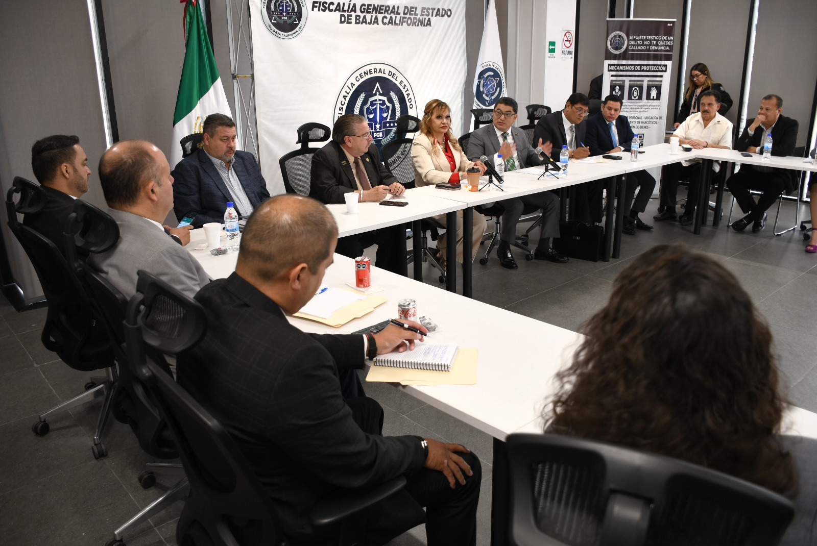 La Fiscal del Estado convocó a esta reunión a los recientemente nombrados fiscales regionales de Tijuana, Rubén Alfredo Maximiliano Ramos Jiménez; de Mexicali, Rafael Cervantes Sánchez; de Ensenada, Gracielo Cebreros Millán; de Tecate, Genaro Adrián Guzmán García; y de Playas de Rosarito, Arturo Mandujano Quezada, a fin de presentarlos ante la comunidad jurídica y que conocieran de cerca los planes que tiene cada uno en los municipios que representan.