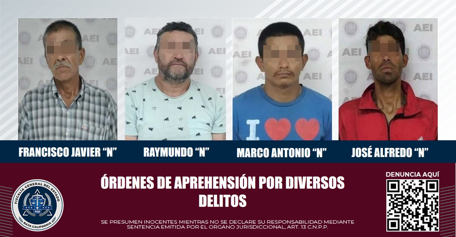 TECATE, B.C. La Fiscalía General del Estado, a través de la Agencia Estatal de Investigación (AEI), cumplimentó cuatro órdenes de aprehensión por los delitos de robo de vehículo, daño en propiedad ajena, violencia familiar y lesiones.