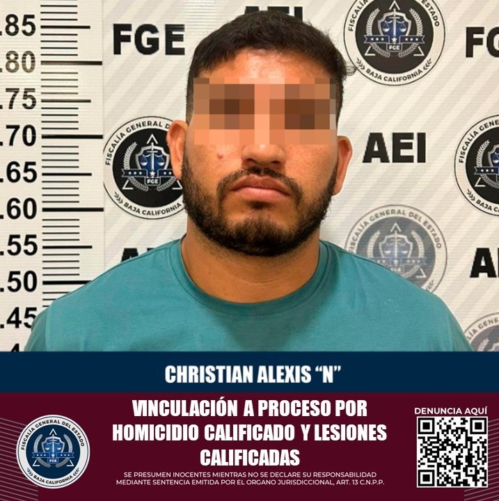 TIJUANA, B.C. El agente del Ministerio Público presentó en la audiencia de vinculación a proceso todos los elementos de prueba necesarios para que Christian Alexis "N", conocido como "El Bimbo", fuera sujeto a un proceso penal por los delitos de homicidio calificado y lesiones calificadas, informó la Fiscalía General del Estado.