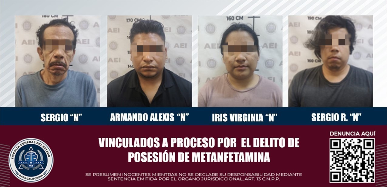TIJUANA, B.C. La Fiscalía General del Estado, a través del Ministerio Público de la Fiscalía Especializada en Contra del Narcomenudeo, logró que fueran vinculados a proceso penal cuatro acusados por el delito de posesión de metanfetamina.