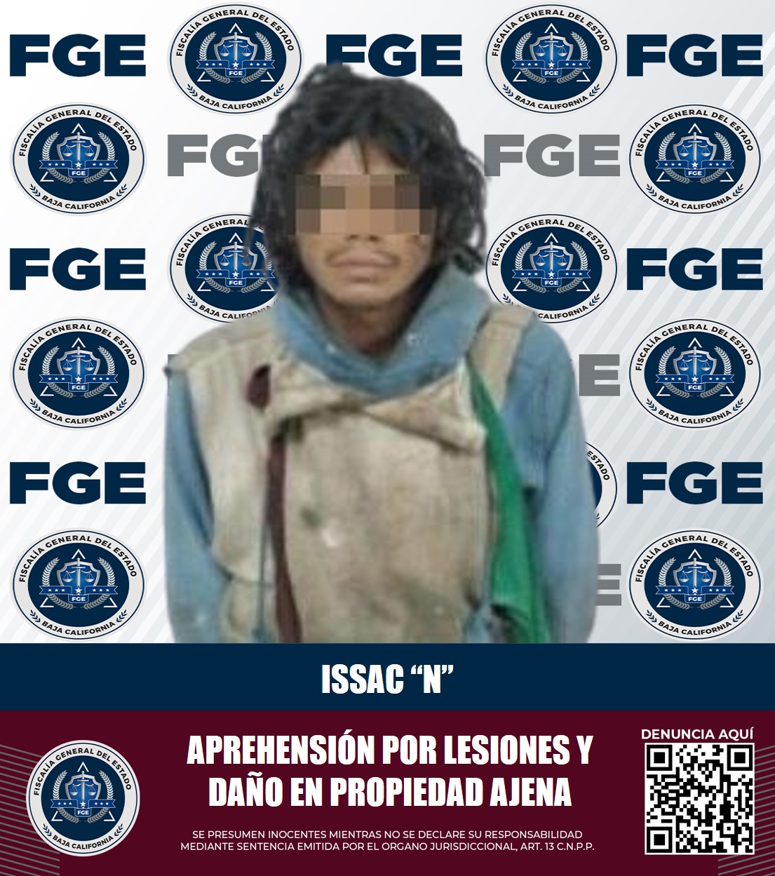 TECATE, B.C. Labor de investigación efectuada en gabinete y campo por parte de agentes investigadores de la Fiscalía Regional de Tecate, derivó en la cumplimentación de una orden de aprehensión en contra de Issac “N”, quien es señalado como presunto responsable de los delitos de lesiones y daño en propiedad ajena.