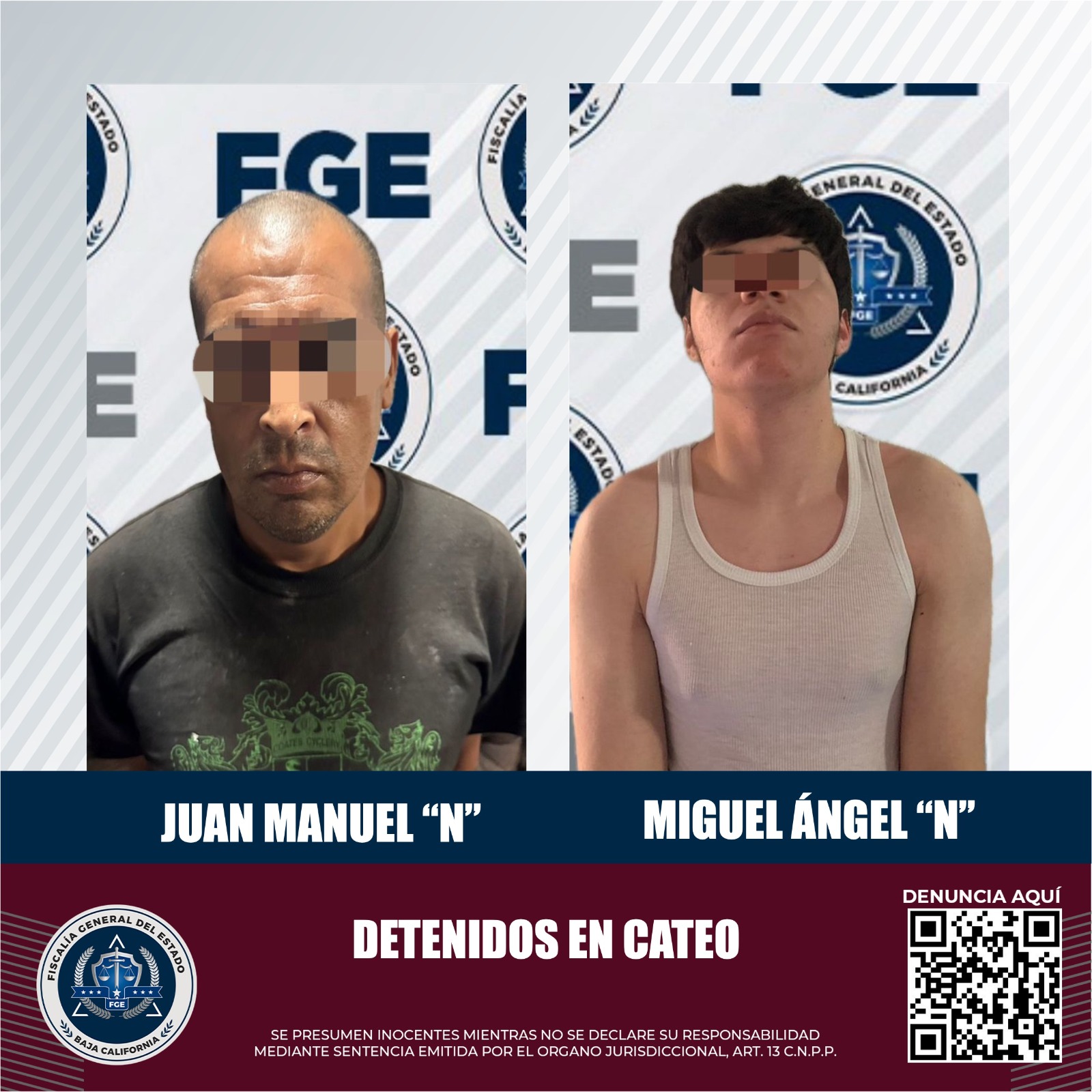 El mandato judicial se efectuó el día 25 de octubre del presente año, en un domicilio ubicado en el fraccionamiento El Cóndor de esta ciudad, donde fue posible la detención de Juan Manuel “N” y Miguel Ángel “N”.