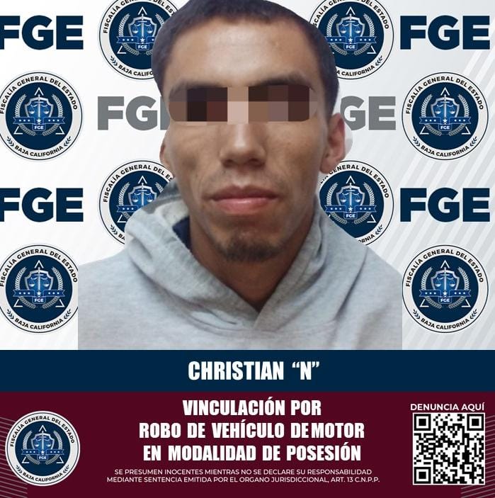 ENSENADA, B.C. La Fiscalía Regional de Ensenada logró la vinculación a proceso de Christian “N”, quien, el 25 de octubre de este año, fue detenido por conducir un vehículo que había sido previamente robado.