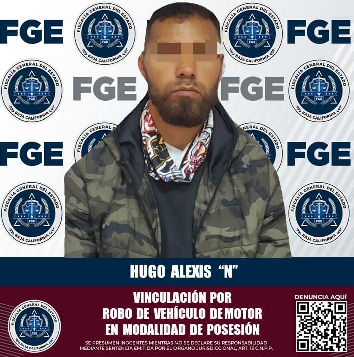 SAN QUINTÍN, B.C. La Fiscalía Regional de San Quintín obtuvo auto de vinculación a proceso penal contra un sujeto, presuntamente, involucrado en la comisión del delito de robo de vehículo de motor en la modalidad de posesión.