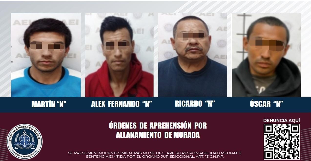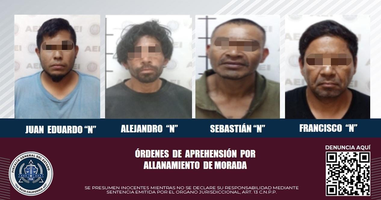 El operativo de búsqueda de estos fugitivos investigados por ingresar sin autorización a inmuebles previamente asegurados por la Unidad Especializada en Narcomenudeo, se ejecutó en las colonias Bustamante, Villas del Rey, Zona Centro, Lomas de Valle Verde, Maneadero y colonia 2 de Septiembre.