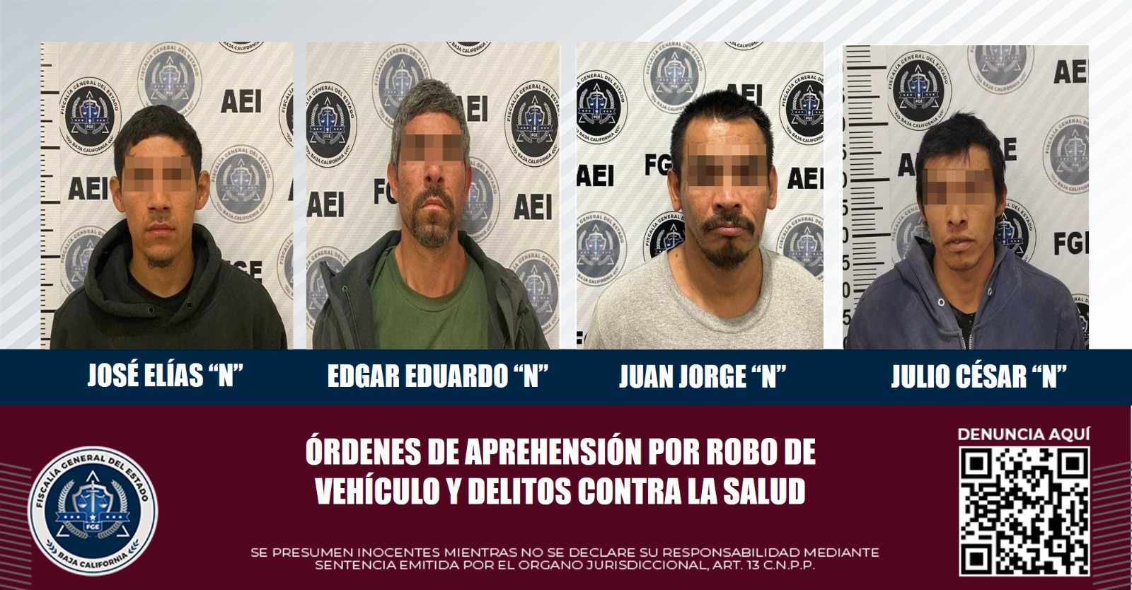 TIJUANA, B.C. Elementos de la Agencia Estatal de Investigación (AEI) de la Fiscalía General del Estado (FGE), mediante sus acciones de gabinete y campo, dieron cumplimiento a órdenes de aprehensión contra cuatro sujetos, tres de ellos investigados por robo de vehículo y otro por delitos contra la salud.