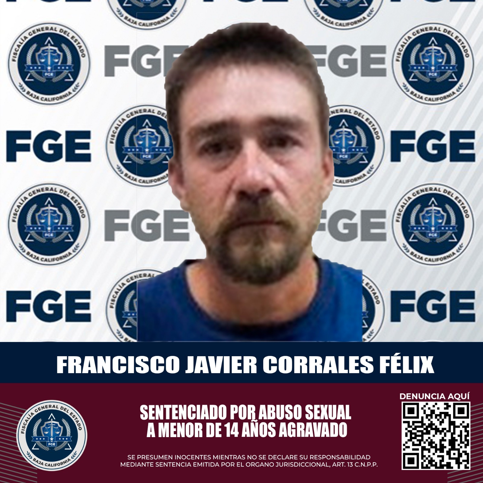 MEXICALI, B.C. Con base en los elementos de pruebas presentados, la Fiscalía General del Estado (FGE), obtuvo una sentencia de 10 años de prisión para Francisco Javier Corrales Félix, por el delito de abuso sexual a menor de 14 años agravado.