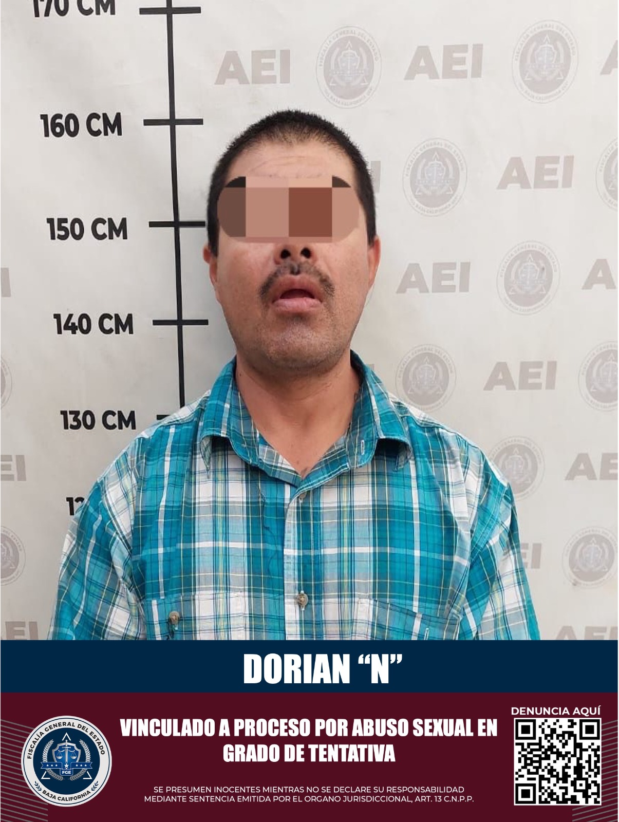 MEXICALI, B.C. La Fiscalía General del Estado, a través de la Unidad de Investigación de Delitos con Detenido Poniente, logró la vinculación a proceso de Dorian “N”, por su presunta responsabilidad en el delito de abuso sexual en grado de tentativa.