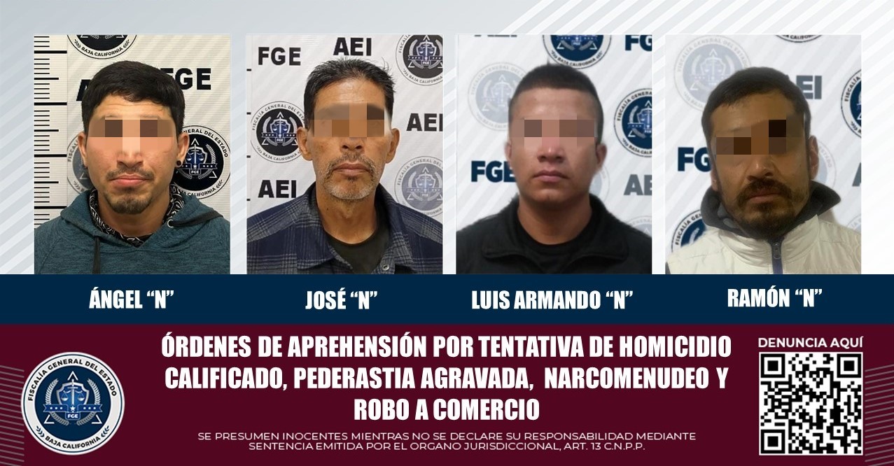 TIJUANA, B.C. La Fiscalía General del Estado, logró la detención de cuatro personas que contaban con orden de aprehensión activa, en casos diversos, por los delitos de homicidio calificado en grado de tentativa, narcomenudeo, pederastia agravada, y robo calificado a establecimiento comercial.