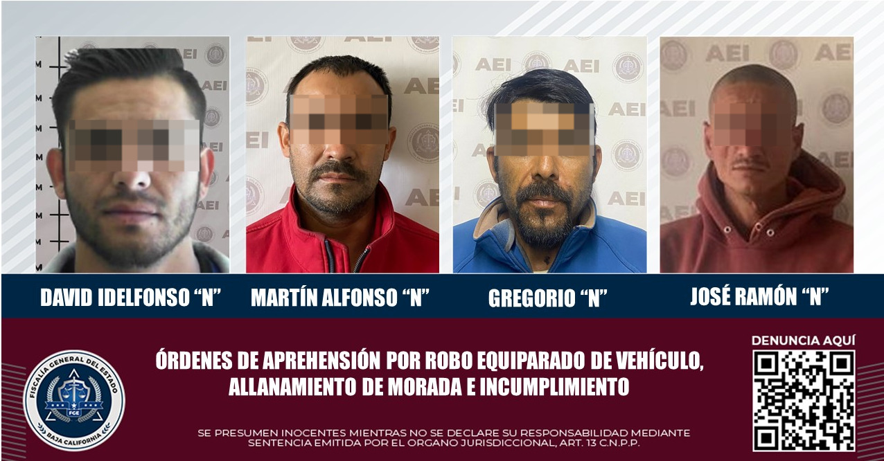 ENSENADA, B.C.  Por medio de actos de operatividad e investigación, agentes de la Fiscalía General del Estado cumplimentaron órdenes de aprehensión contra cuatro sujetos por su presunta participación en hechos delictivos.