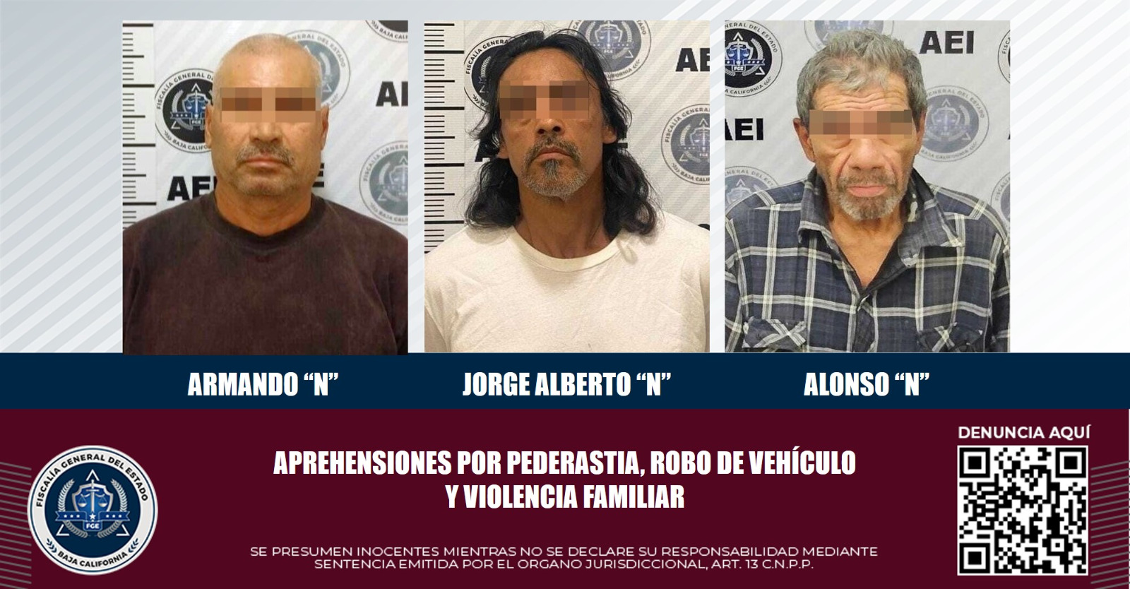 TIJUANA, B.C. Mediante estrategias de investigación desarrolladas por elementos de la Agencia Estatal de Investigación (AEI) de la Fiscalía General del Estado (FGE), se logró poner a disposición de la autoridad judicial a tres individuos que contaban con orden de aprehensión activa.