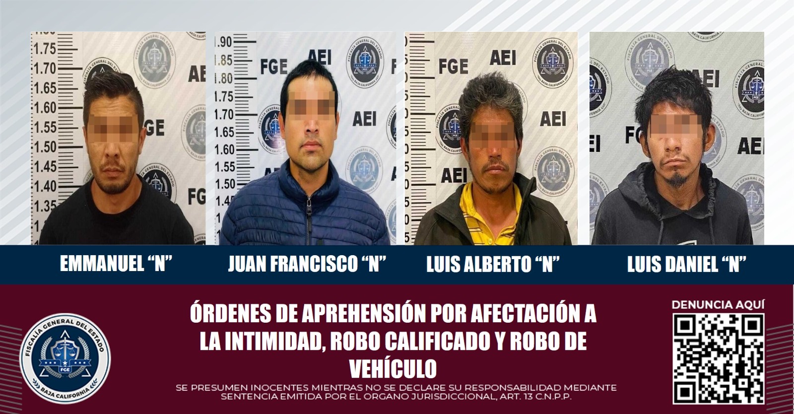 TIJUANA, B.C. Cuatro sujetos con orden de aprehensión fueron puestos a disposición de la autoridad juzgadora, una vez que elementos de la Agencia Estatal de Investigación (AEI), de la Fiscalía General del Estado (FGE), cumplimentaran los mandamientos judiciales.