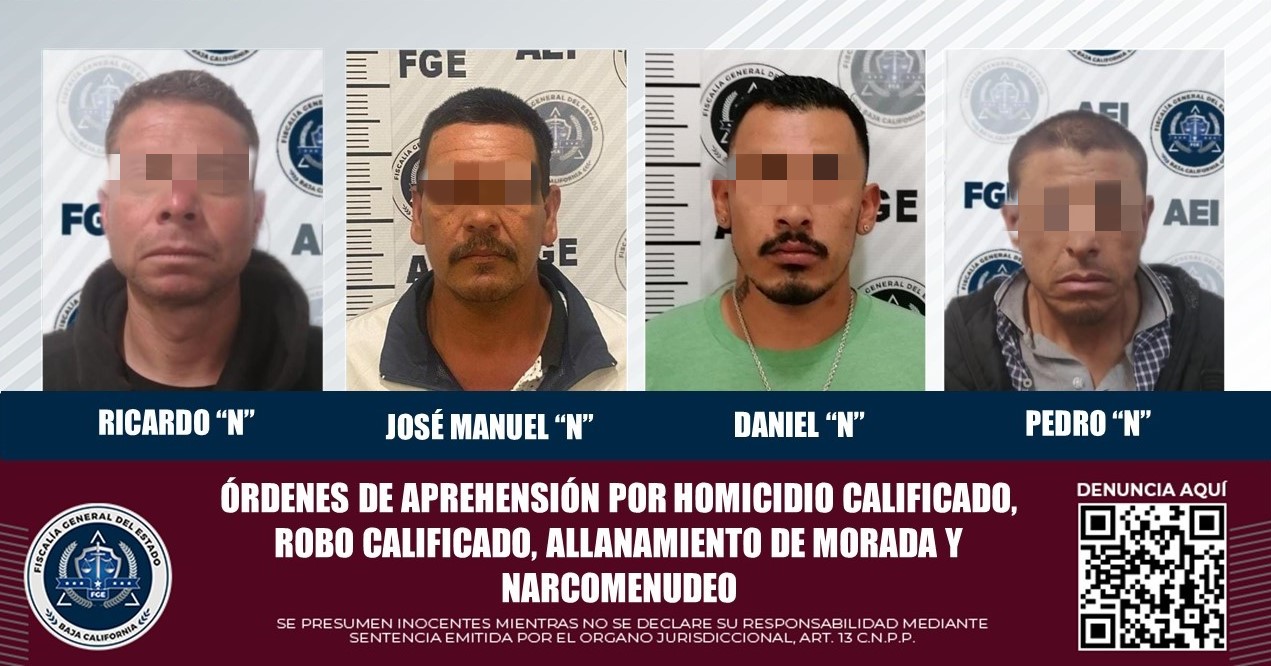TIJUANA, B.C. La Fiscalía General del Estado, a través de la Unidad de Aprehensiones de la Agencia Estatal de Investigación, ha logrado la captura de cuatro individuos que eran buscados por jueces de control debido a las órdenes de aprehensión existentes en su contra.
