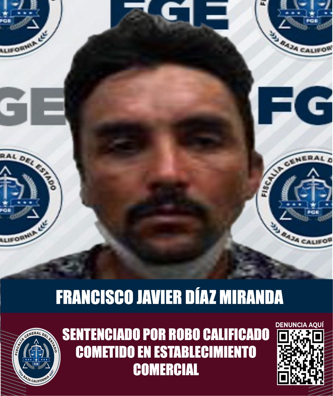 MEXICALI, B.C. La Fiscalía General del Estado, logró sentencia condenatoria en contra de Francisco Javier Díaz Miranda, por el delito de robo calificado a establecimiento comercial abierto al público.