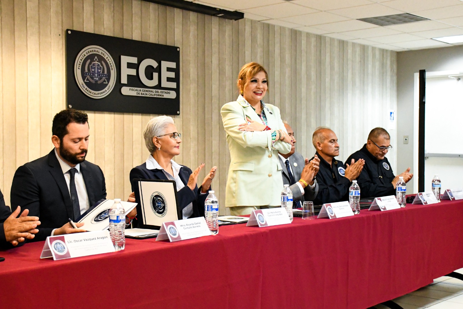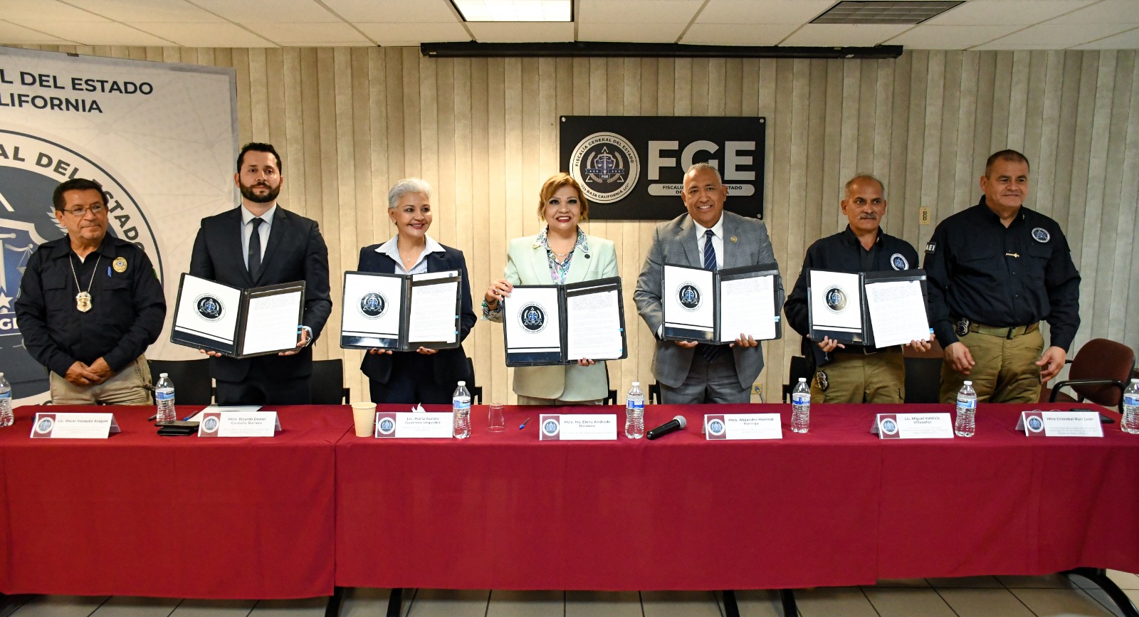 Durante la firma, la Fiscal General estuvo acompañada de Ricardo Daniel Garduño, Oficial Mayor; Cristóbal Ruiz León, Comisionado de la Agencia Estatal de Investigación; María Aurora Guerrero Urquidez, presidente del Consejo Directivo Fidepol; y Alejandro Monreal Noriega, presidente de la Federación de Policías de Baja California.