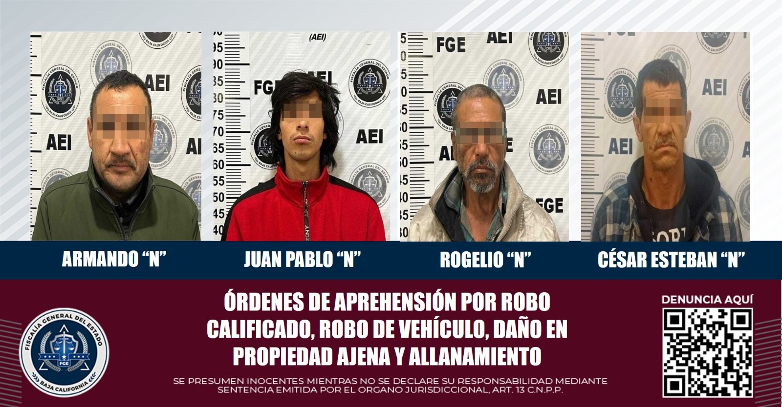 TIJUANA, B.C. Con trabajo de gabinete y campo, elementos de la Fiscalía General del Estado, adscritos a la Agencia Estatal de Investigación, cumplimentaron órdenes de aprehensión por los delitos de robo calificado, robo de vehículo, daño en propiedad ajena y allanamiento.