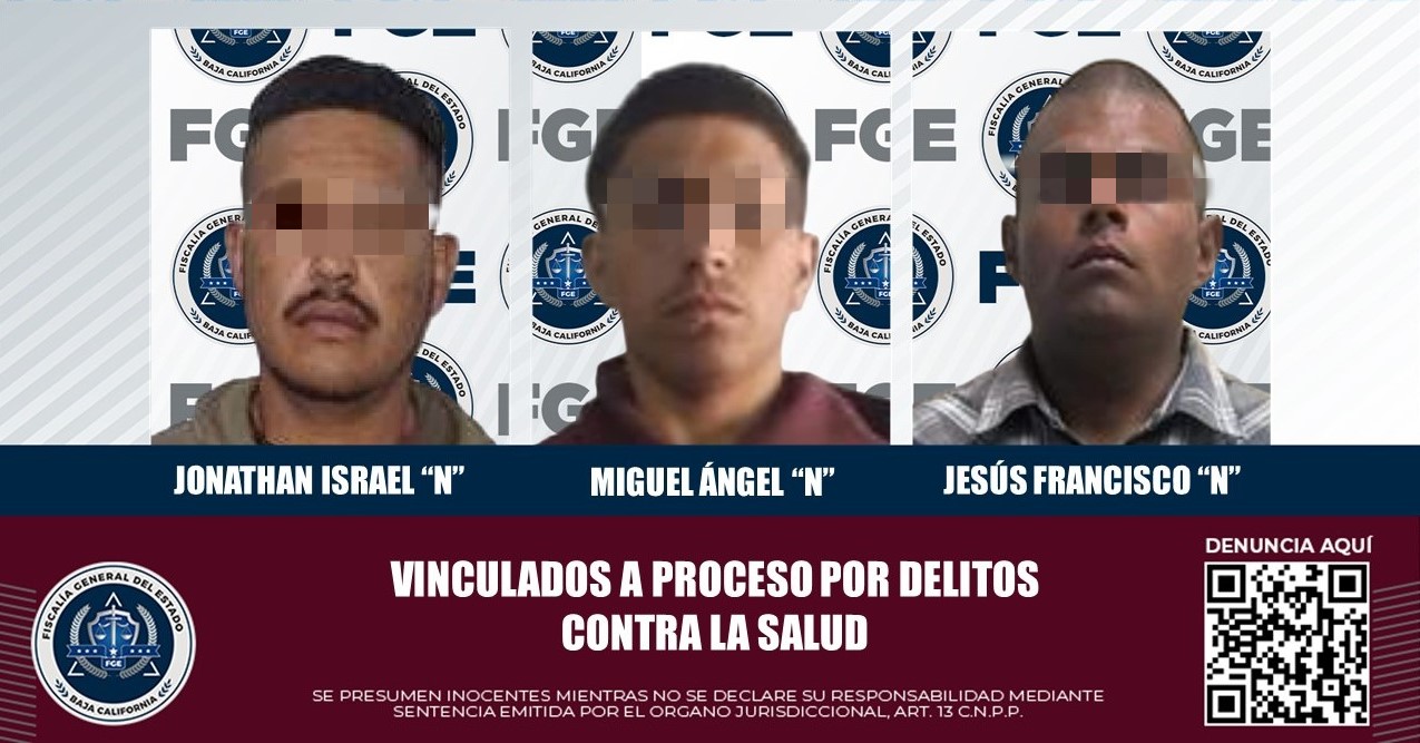 TIJUANA, B.C. La Fiscalía General del Estado informa que, tres imputados por delitos contra la salud en la modalidad de narcomenudeo, fueron vinculados a proceso penal, luego de que los elementos de prueba presentados por el Ministerio Público fueron suficientes para que los jueces de control determinaran iniciar procesos en su contra.